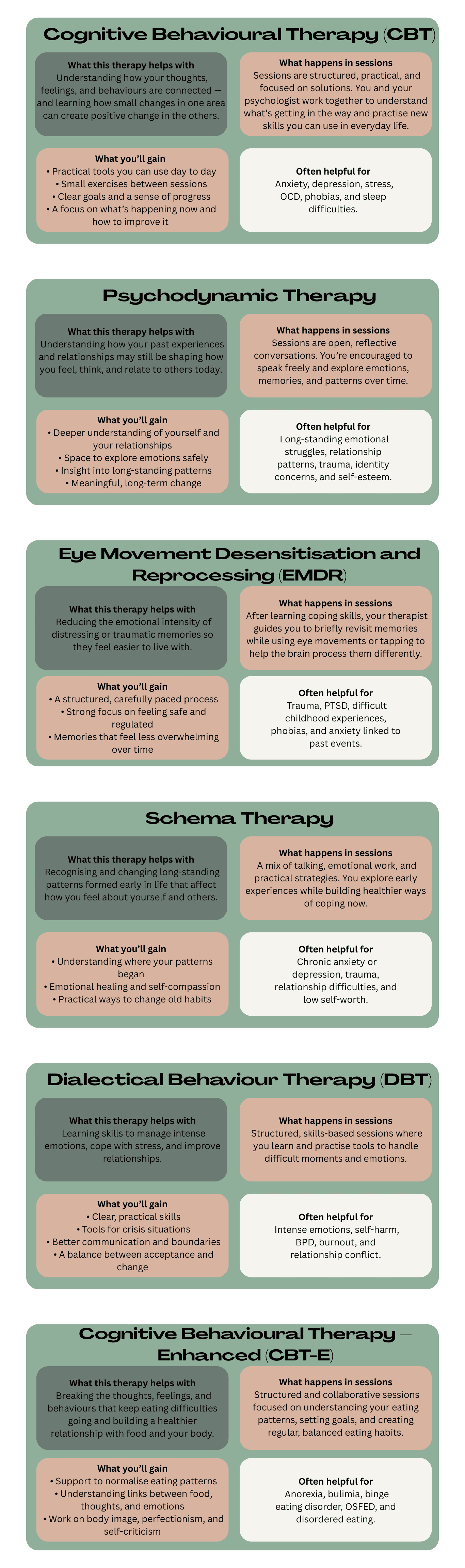 Before I became a psychologist, I had no idea how many different therapy types were out there, or that psychologists often specialise in particular approaches. I assumed that if you were seeing someone for general mental health support, everyone pretty much worked the same way.