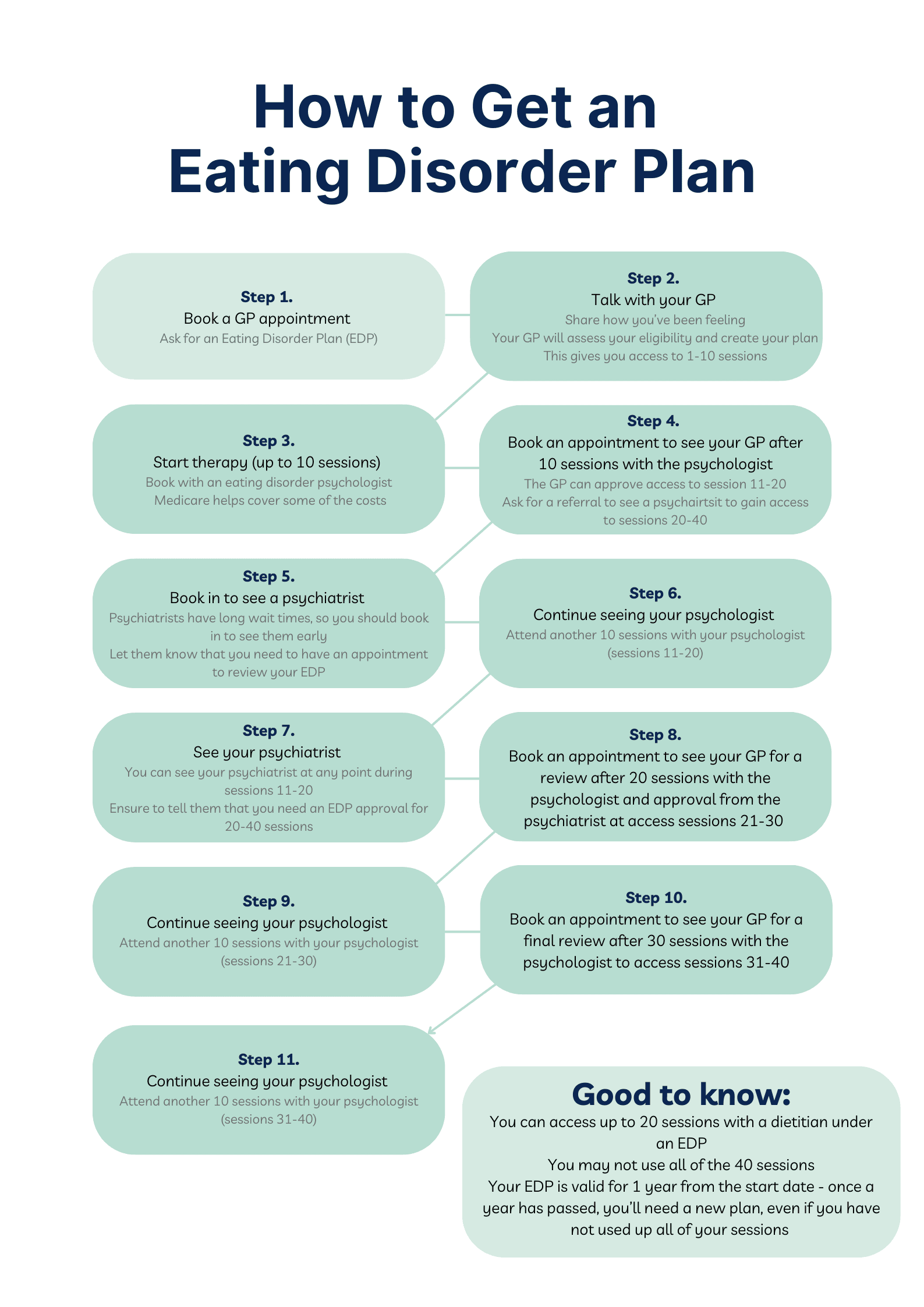You access an EDP in the same way as a Mental Health Care Plan (MHCP), and your GP will let you know if you meet the eligibility criteria. An EDP has more specific rules, so it’s important to keep track of your sessions to make the most of your support.